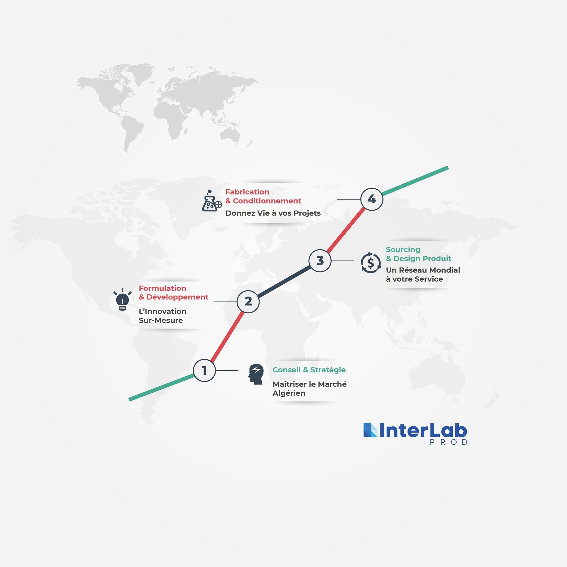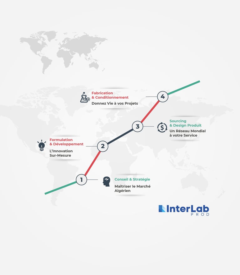 Chez INTERLAB PROD, nous avons créé un écosystème complet pour transformer vos ambitions en succès commerciaux. En combinant les standards internationaux et une maîtrise parfaite du tissu industriel local, nous accompagnons les entrepreneurs de la cosmétique et des compléments alimentaires à chaque étape.